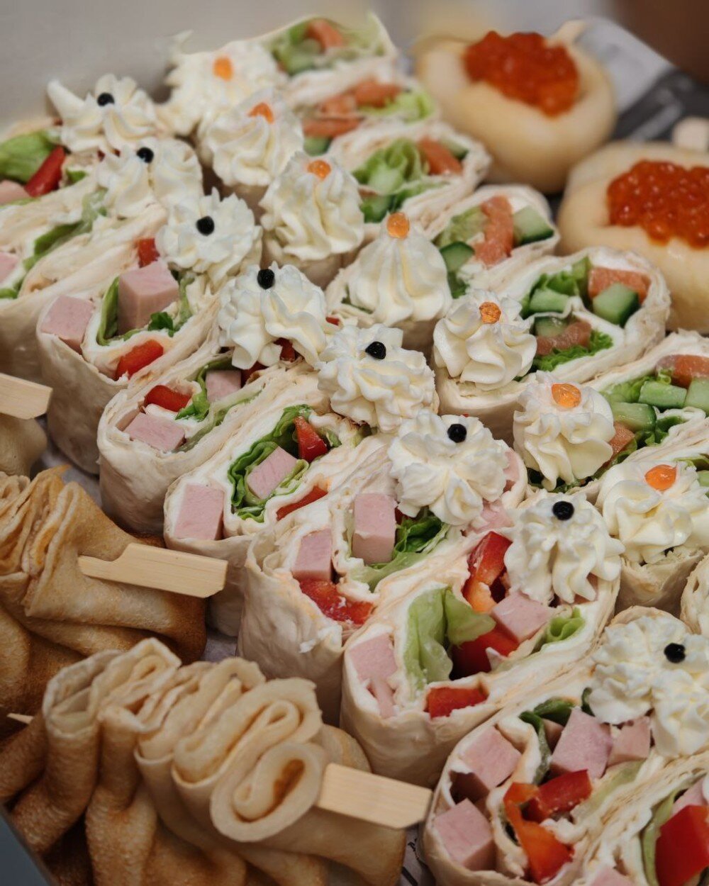 - Блины улитка с творожным сыром и икрой 4 шт - Блинные мешочки с жульеном 4 шт - Рулет из лаваша с ветчиной, свежим перцем и творожным сыром 10 шт - Рулет из лаваша с слабосоленой форелью, огурчиком и творожным сыром 10 шт