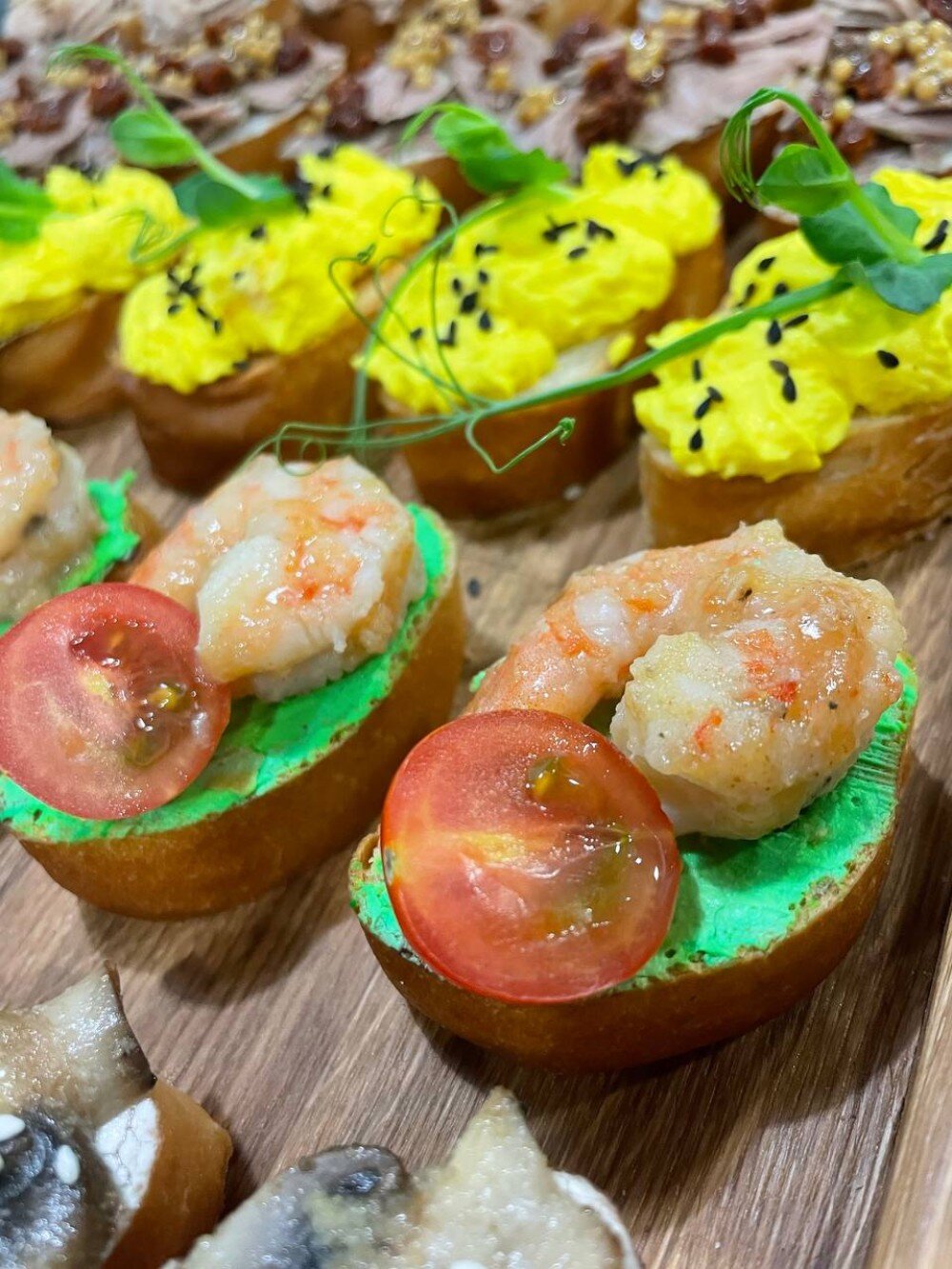 Кростини с королевской креветкой и томатом черри на творожном муссе с авокадо